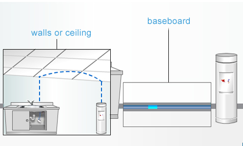 Each installation is a little different. Depending on the cooler location, the water line is either run along the baseboard or through the walls and ceiling to the water cooler.